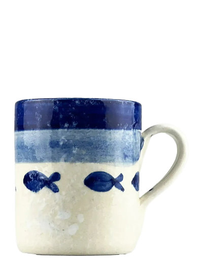 Tilføj et finurligt præg til din kaffepause med vores keramiske krus med gentaget fiskemotiv i blåt. Ideelt til varme drikke – og en legende detalje i din hverdag.