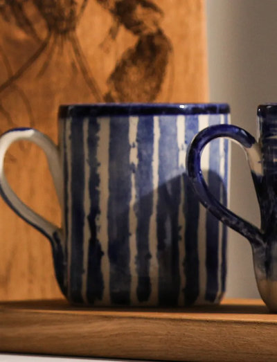 Drik med stil med vores keramiske krus med blå striber. Praktisk og dekorativt – tilføjer farve og karakter til dit krusudvalg.