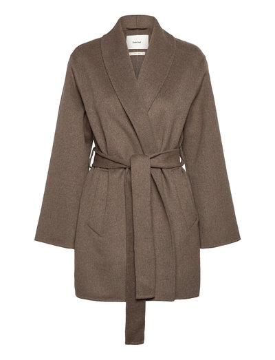 Denne knælange jakke har en spredt krave og sidelommer. Det genanvendte polyesterfor sikrer en behagelig følelse, hvilket gør den til et praktisk og elegant valg til køligere dage. Et bindebælte fremhæver taljen og skaber en flatterende silhuet.