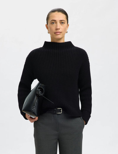 Denne strikkede pullover har en høj hals og fold-op manchetter, og den giver en behagelig, normal pasform. De sænkede skuldre og sideslidserne bidrager til den afslappede stil.