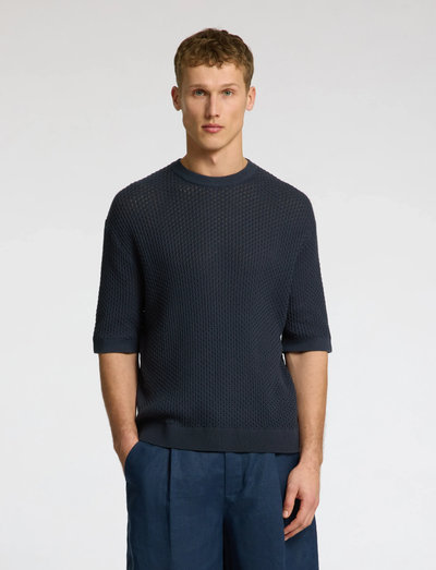 Denne kortærmede T-shirt har en tekstureret strik og et afslappet fit, hvilket giver både komfort og stil. De ribbede manchetter tilføjer en subtil detalje, hvilket gør den til en alsidig tilføjelse til ethvert afslappet outfit.