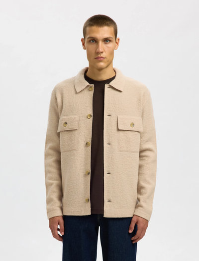 Cardigan i kogt uld med skjortekrave og lange ærmer. Denne overshirt har knaplukning foran, to brystlommer med knaplukning, flatlock-stikningsdetaljer, en sildebensfarvet nakkestrop indvendigt i kraven og et flaglabel i sidesømmen.