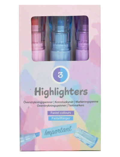 These pastel highlighters are as cute as they are practical!With soft, shimmering ink and a chunky shape for a comfy grip, they’re perfect for adding a stylish touch to your notes. Includes three shades: light blue, lilac, and pink. A must-have for fans of trendy stationery!