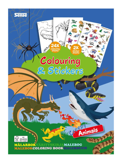 Get ready for a wild coloring adventure! This creepy-themed coloring book is full of fearsome fun—flaming dragons, hairy spiders, sneaky lizards, slithering snakes, and more. In the center, you’ll find a full spread of colorful stickers to decorate your pages. Let your imagination run wild with this creepy and cool book from Sense!