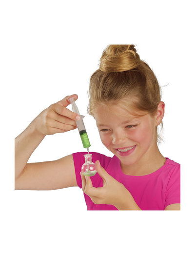 Sættet indeholder 5 plastikflasker med korklåg, gennemsigtigt slim (50 ml), rødt, blåt og gult farvestof, sprøjte, målebæger, rørepind, pipette, perler i 6 farver og 45 glimmerklistermærker.