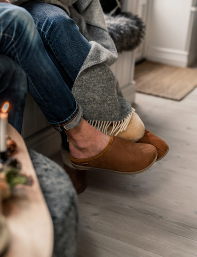 Disse slip-on hjemmesko tilbyder varme og komfort og har en blød foring af fåreskind. Gummisålen sikrer greb og stabilitet til indendørs brug.