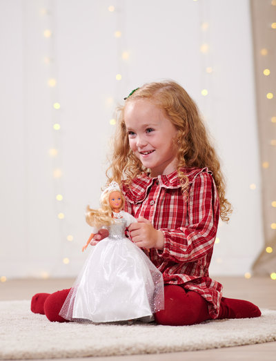 Steffi dressed in a dreamy white glitter dress with a fur jacket, necklace, and tiara with sparkling rhinestones. 29 cm. From 3 years.