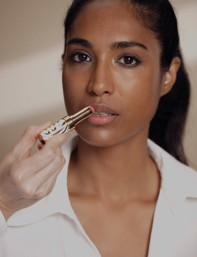 Påfør læbestiften direkte på læberne eller ved hjælp af en børste. Dækningen kan bygges op som ønsket: en påføring giver læberne et let strøg af farve og glans, mens flere påføringer øger intensiteten og glansen.