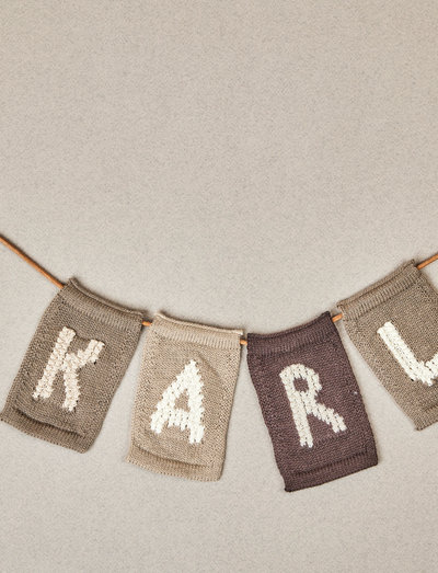 Bogstav til navne-flag-ranke. Hæng dit barns navn på lædersnor med disse smukke bogstav-flag i mange farver. Lædersnor købes separat.