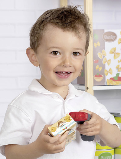 Feel like you're in a real supermarket! The electronic supermarket cash register from Smoby leaves nothing to be desired when shopping. The cash register is equipped with a real calculator. Here you can learn how to count while playing. Calculator functions: +, -, x, /, =, CE, on, off and automatic shutdown. The scanner looks real with the beep sound and red light. The cashiers can use the microphone to provide information about new offers. If customers want to pay with cash, the change can be paid out using the cash drawer. The cash register comes with1 orange juice can, 2 dummy boxes (cookies/pasta), 4 cashier's receipts, 12 bills, 9 coins, and 1 credit card. A total of 30 accessories. Made in France. Batteries: 1x LR54 button cell (included) + 2x LR03/AAA (not included). Dimensions (LxWxH): 21 x 21.5 x 16 cm. Suitable for children from 3 years.