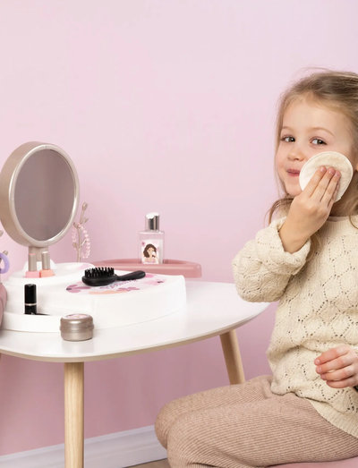 My beauty studio from Smoby is a table top product using which take up 3 main themes of beauty through its accessories: hairstyling, nail care, and makeup. With its soft colors and its sleek and optimized design, the product will seamlessly fit in a child's room. The product features a removable and adjustable mirror to suit the child's height and rotating shelves that reveal additional storage areas. and two jewelry trees where the child can hang bracelets, rings, necklaces, etc.15 accessories are included: 2 lipsticks with mechanical functions*, 2 nail polishes*, 1 mascara*, 1 pump bottle, 1 cream pot, 1 lotion bottle, 1 dual-material makeup remover cotton pad, 1 brush, 2 hair ties, 2 hairpins, 1 bracelet (* The make-up is fake). Suitable for children from 3 years. Made in France.