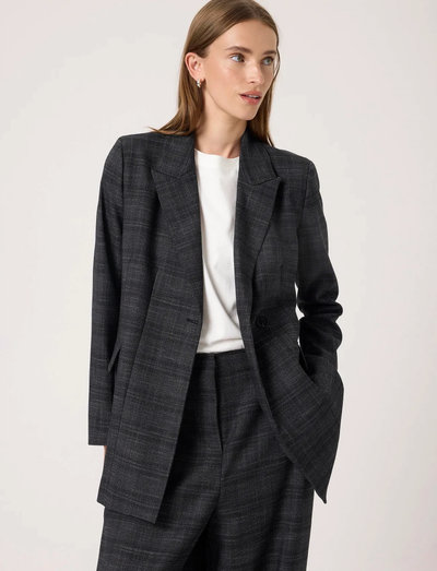 Denne skræddersyede blazer defineres af en dobbeltradet silhuet, der giver et sofistikeret præg til ethvert outfit. De strukturerede skuldre og hakkede revers bidrager til det polerede udseende, mens det subtile ternede mønster giver visuel interesse.