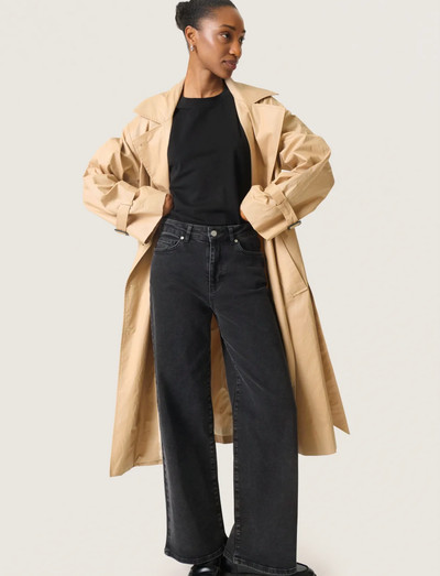 Denne trenchcoat har en tidløs silhuet med en dobbeltradet front og et bindebælte i taljen. De lange ærmer er afsluttet med justerbare manchetstropper, mens de brede revers giver et klassisk og sofistikeret udtryk.