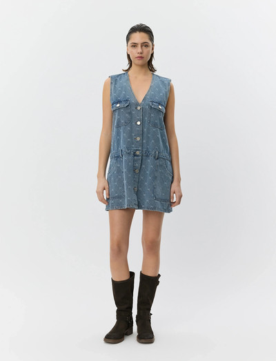 Denne minikjole i denim har knaplukning foran og praktiske lommer. Det ærmeløse design gør den ideel til lagdeling eller til at bære alene i varmere vejr.