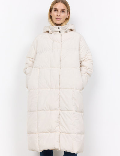 Denne lange, vatterede frakke er fremstillet af 100% polyester og giver fuld dækning og varme. Den har en høj krave og en varm hætte for ekstra beskyttelse mod elementerne. Den sikre lynlås- og knaplukning samt ribkanterne sikrer en tætsiddende pasform, hvilket gør den til et alsidigt og stilfuldt valg til enhver lejlighed.