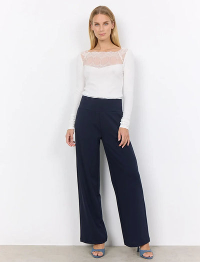Disse klassiske bukser har en flatterende høj talje og brede ben, der giver en moderne silhuet. De er fremstillet i en behagelig genanvendt polyesterblanding med elastisk kvalitet, hvilket gør dem ideelle til at skabe et minimalistisk look, når de kombineres med en klassisk skjorte og cardigan.