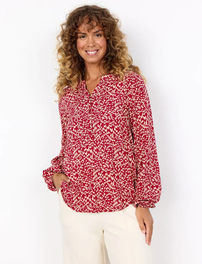 Denne bluse er fremstillet af LENZING™ ECOVERO™ Viscose og har en flatterende V-udskæring og knaplukning foran. Lange ærmer med elastiske manchetter bidrager til det behagelige design. Det abstrakte print gør den alsidig og nem at style med både skræddersyede bukser og afslappede jeans.
