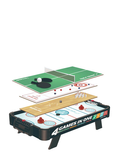 4 games in 1 table game, 69 x 37 x 22 cm. with 4 different games in one, the fun never ends, and it’s perfect for all ages! the game includes air hockey, table tennis, curling, and bowling, with all the necessary game accessories. cord-free! powered by 3xaa batteries (not included). manual with assembly instructions, rules, and scoreboards.