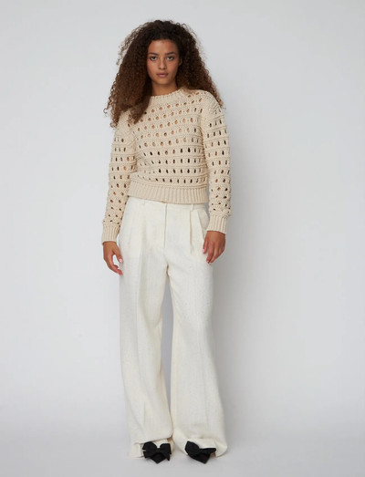 Denne sweater har et iøjnefaldende hæklet design, der giver et unikt tekstureret look. Den er afsluttet med ribdetaljer ved manchetter, halsudskæring og kant.