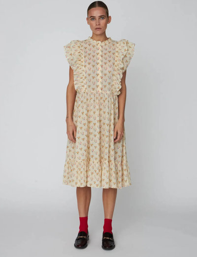 Letvægtsbomuld skaber en luftig fornemmelse i denne charmerende kjole. Flæsedetaljer ved skuldrene tilføjer et strejf af romantik, mens det all-over print tilfører et legende element til designet. En let rynket nederdel fuldender looket.
