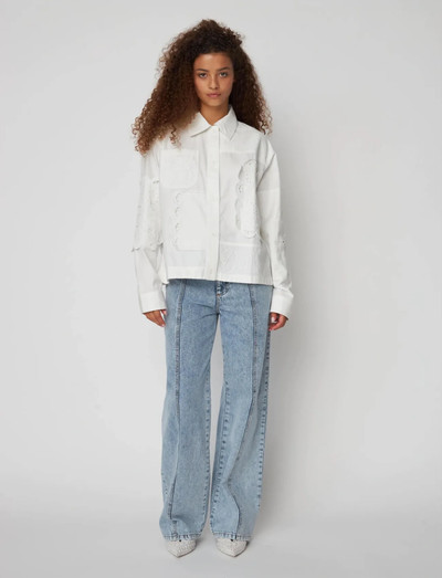 Denne løstsiddende skjorte er udsmykket med fine broderier. Den har en klassisk krave, knaplukning og broderede lommer. Den er fremstillet af et meget sart materiale, så vær forsigtig og hold den væk fra skarpe genstande.
