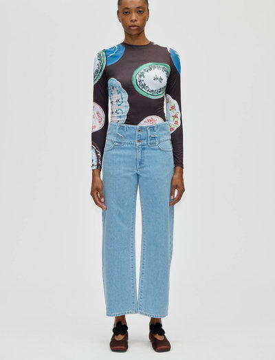 Denne top er fremstillet i strækbart jerseystof og har en tætsiddende pasform, lange ærmer og en klassisk rund hals. Det gennemgående mønster tilføjer et karakteristisk præg.