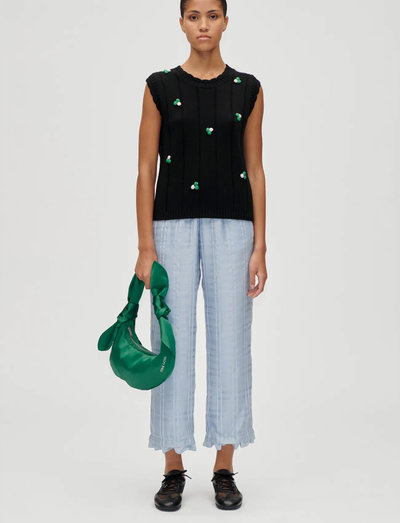 Delikate broderidetaljer fremhæver denne strikkede vest og skaber en blød, feminin silhuet. Den mellemtykke uldkonstruktion gør den ideel til lagdeling eller til at bære alene.