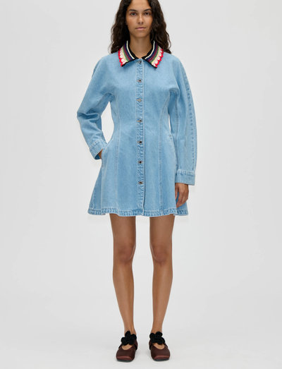 Denne minikjole er fremstillet i denim og har knaplukning foran og lange ærmer. Den udstrakte kant tilføjer et strejf af legesyghed, mens den aftagelige hæklede krave giver alsidighed.