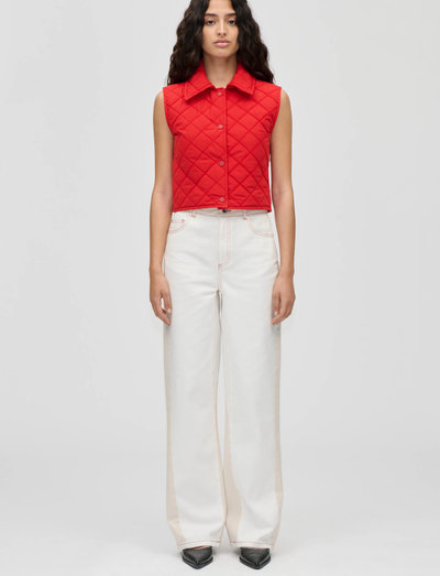 Wide fitDisse denimjeans med brede ben har en markant, snoet sidesøm, der giver en moderne silhuet. Designet omfatter kontrasterende off-white og hvide paneler, fremhævet af røde syninger. Funktionelle detaljer inkluderer en lynlåslukning foran samt for- og baglommer.