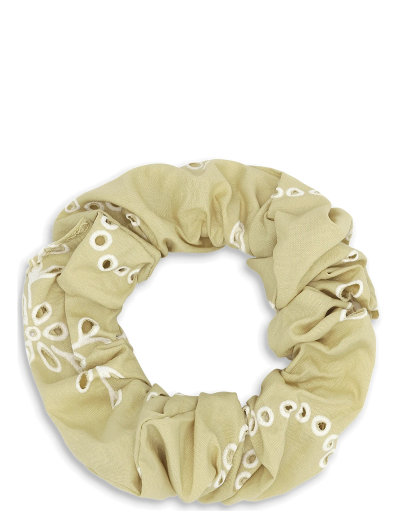 Delikat blomsterbroderi tilføjer et strejf af charme til denne scrunchie. Det elastiske design sikrer et sikkert og behageligt hold, hvilket gør den til en praktisk og stilfuld tilføjelse til enhver hårtilbehørssamling.