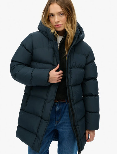 Hold dig varm i denne mellemlange pufferjakke, der er designet med en afslappet pasform for ultimativ komfort. Den har en hætte med en ekstra krave for ekstra varme samt lynlås- og trykknaplukning og en justerbar kant forneden med elastiksnor. Jakken er fuldendt med manchetter med hul til tommelfingeren, to lynlåslommer og en inderlomme, og den er afsluttet med broderet tekst på ryggen og et signaturmærke på ærmet.