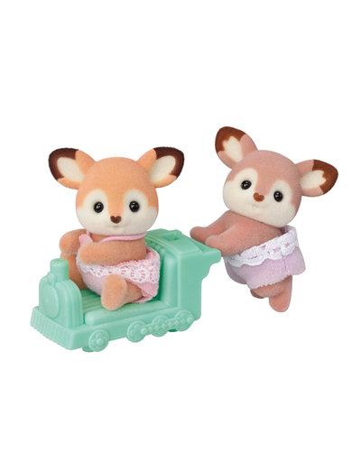 Dette sæt indeholder hjortetvillingerne med en klapvogn. Figurerne har bedårende store ører og forskellige farver og mønstre på ørerne! Den ene tvilling kan sidde i klapvognen. Klapvognen kan forbindes med klapvogne fra andre tvillingsæt. Kombiner med 5799 Hjortefamilien, 5801 Hjortebabyer -Blomster Gynge Sæt- og 5818 Børnehave Prinsesse Lege Sæt (sælges separat) for endnu mere sjov og fantasifuld leg med hele familien! Figurernes hud er blød. Egnet til børn fra 3 år.