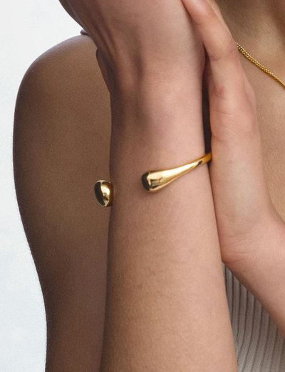 Dette lette armbånd er nemt at bære og har karakteristiske dråbeformede ender. Det er fremstillet i messing og belagt med 18K guld, hvilket giver et elegant touch til ethvert outfit. Fås i to størrelser.