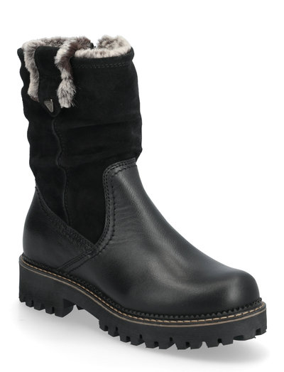 Disse ankelstøvler har en robust profilsål, der giver et pålideligt fodfæste og et stilfuldt udtryk. Fuskepelskanten tilføjer et strejf af varme og visuel interesse, hvilket gør dem til et praktisk og moderigtigt valg til køligere vejr.