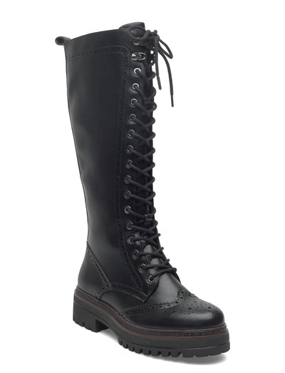 Snøredetaljer og brogue-accenter giver disse høje støvler et karakteristisk look. Den robuste sål giver et pålideligt fodfæste, mens det høje skaft giver ekstra dækning.