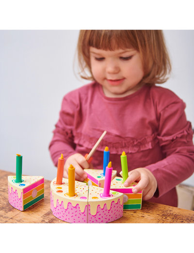 Dekorativ og farverig lagkage i massivt træ, toppet med 6 lys i forskellige farver og et jordbær i midten.