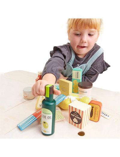 Sæt med 14 forskellige dagligvarer i træ, klar til rolleleg som købmand, supermarked, kunde, madlavning og så videre.