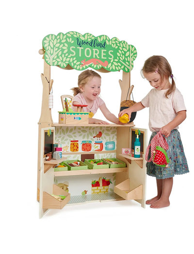 På den ene side er en Woodland Stores -legebutik med 2 døre, der åbner op til hylderne med varer og 2 tavler, hvorpå man kan skrive dagens tilbud med tavlekridt (medfølger ikke).