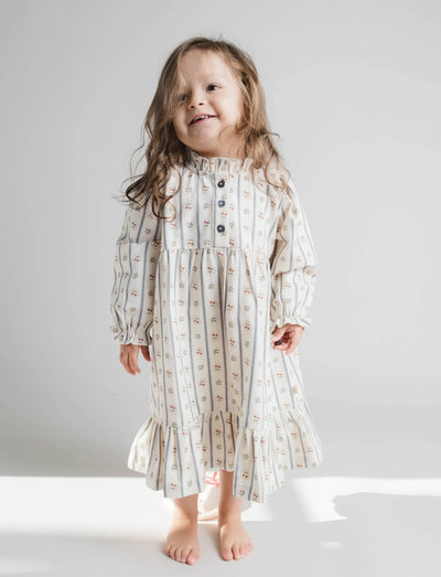 Flicka-kjole med lille flæse rundt om halsen. Elastik ved ærmekanten. Rynker omkring taljen.