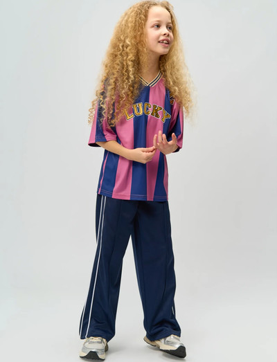 Sporty and trendy T-shirt from tHE NEW with bold stripes in a beautiful color combination. The shirt features a relaxed fit with a classic V-neck and contrast-striped rib details, giving it an authentic sporty look. The word "LUCKY" is displayed prominently on the chest, while a stylish gold number "2" is placed on the shoulder. The back is adorned with a large gold number "2," completing the athletic-inspired design. Perfect for everyday wear and a cool, casual style. - Oversized fit for a relaxed look. - Soft and breathable fabric. - V-neck with contrast stripes. - Bold statement prints on the front and back.