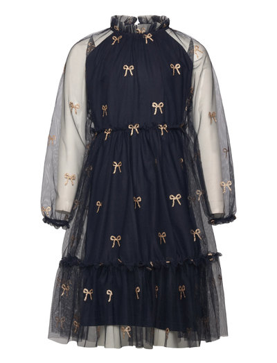 Elegant and whimsical dress from THE NEW, perfect for special occasions. The dress is adorned with delicate gold-glitter bows, adding an exclusive touch. The long sleeves are sheer and finished with elasticated cuffs, providing an airy and lightweight fit. The dress is designed with two layers: a soft and breathable cotton underdress and an outer layer of soft, transparent mesh. It features a button closure at the neck for easy dressing. A beautiful ruffle trim at the waist and skirt adds extra volume and elegance. - Midi length, falling gracefully below the knees. - Regular fit with an A-line cut and elasticated waist for a feminine silhouette. - Ruffle trims. - Button closure at the neck. - Decorated with small gold-glitter bows. - Two-layer design.