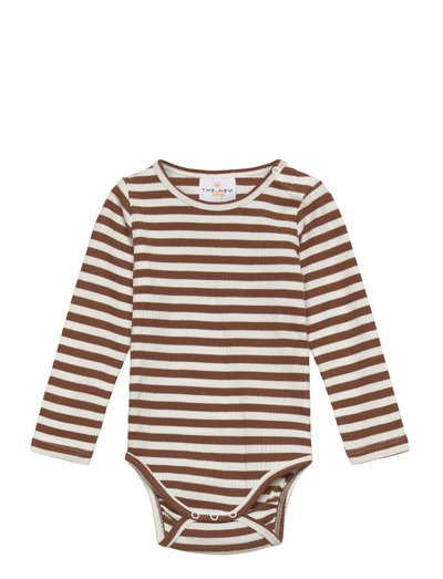 Striped and long-sleeved baby bodysuit in a stylish and stretchable rib fabric. This simple bodysuit from THE NEW siblings is a daily essential. The quality is soft, lightweight, and breathable. Whether your little one is crawling, playing, or dancing, this bodysuit is a great companion for new adventures. Pair it with the matching leggings for an adorable coordinated set.- Regular fit with long sleeves and a round neckline.- Ribbed fabric in brown and white.- Convenient snap closure at the crotch and on one shoulder.- GOTS Organic certified by CU842535