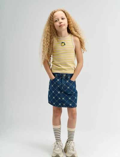A girls sleeveless top made from 100% organic cotton. It has a round neckline with bound edges at the neck and armholes and a straight hem. The body features narrow horizontal stripes with a small lemon embroidery at the chest. The straight silhouette works well on its own in warm weather and layers easily under shirts or cardigans. Simple to style with shorts, skirts, or jeans.- 100% organic cotton fabric- Sleeveless cut with round neckline and bound edges- Straight silhouette; suitable for layering and warm seasons- Contains 100% Cotton Organic GOTS. Luxkids is GOTS certified by Control Union, 842535. Only the products which carry the GOTS label and claim are certified.