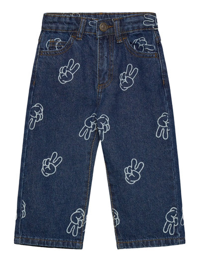 These denim jeans combine a classic look with a fun and playful twist. The pants feature a unique all-over print of small hands making peace signs, giving them a creative and eye-catching expression. With both front and back pockets, they are both practical and stylish. Perfect for active days and a relaxed everyday look!- Regular fit - Classic denim look - All-over print with peace signs - Practical front and back pockets - Rolled-up cuffs for a trendy finish