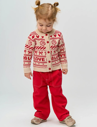 This cardigan from THE NEW Siblings is both cozy and festive perfect for the seasons many warm and loving moments. Its knitted with a charming jacquard pattern featuring hearts, bows, dice, and the word LOVE, creating a playful and affectionate look. The cardigan has ribbed edges and a front button closure, making it easy to put on and take off.- Knitted jacquard pattern - LOVE text detail - Front button closure - Ribbed neckline, cuffs, and hem - Perfect for cozy and festive occasions