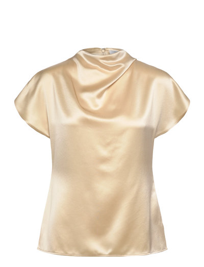 Denne elegante top er fremstillet af tung satin og har en draperet halsudskæring og korte ærmer, der ligner udfoldede blade. Sideslidserne i kanten forbedrer bevægelsesfriheden, hvilket gør den ideel sammen med skræddersyede bukser eller den matchende Reylynn-nederdel for et poleret ensemble.