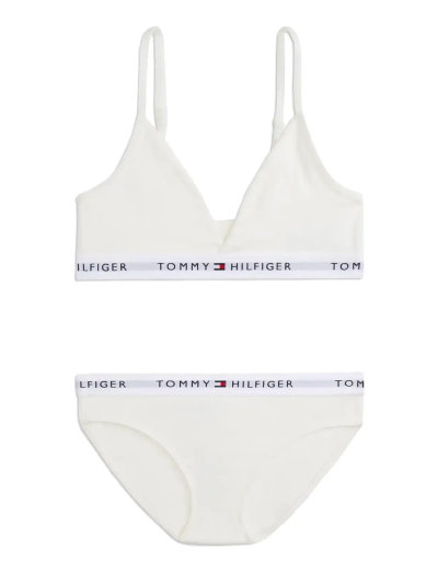 Dette sæt giver en behagelig pasform med sit bløde materiale og elastiske taljebånd. BH'en har tynde stropper og en klassisk silhuet, mens bikinien giver fuld dækning. Begge dele er afsluttet med branding under barmen og rundt om taljen.