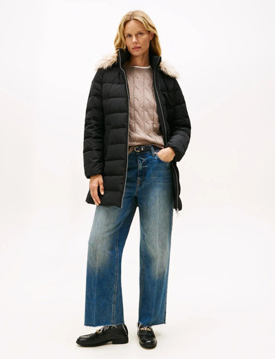 Denne vatterede frakke giver varme og en elegant silhuet og har en hætte med imiteret pelskant for ekstra stil. Det lange design giver ekstra dækning, hvilket gør den ideel til koldere dage. En alsidig beklædningsgenstand til enhver garderobe.