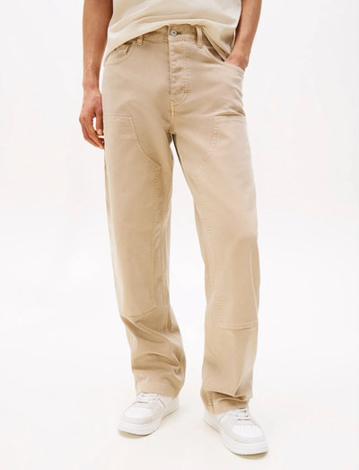 Disse bukser har en klassisk snedkerstil og er forstærket ved knæene for ekstra slidstyrke. Designet har praktiske elementer og en behagelig pasform, hvilket gør dem velegnede til hverdagsbrug.