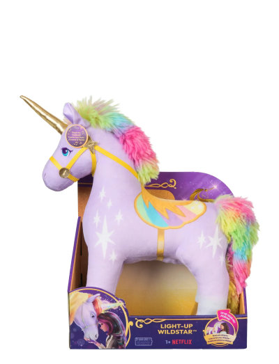 Træd ind i Enhjørningeakademiet, hvor venskab hersker. Gør legen magisk og fejr båndet mellem rytter og enhjørning med Wildstar, Sophias regnbue-strålende enhjørning. Denne imponerende 38 cm høje plysfigur indfanger magien i Wildstar med alle hendes autentiske karakterdetaljer fra den animerede NETFLIX-serie og den populære børnebogsserie. Wildstar har blødt lyselilla plys med glitrende Lysmagi-mærker og ser klar ud til eventyr i en regnbuefarvet sadel og hovedtøj med gulddetaljer, der matcher hendes metalliske gyldne hove og horn. Tryk hende på panden for en magisk overraskelse – Lysmagi-mærkerne lyser! Hun har også klare blå øjne, satinforede lilla ører og en lang, blød man og hale, der stråler i regnbuefarver. Disse detaljer tro mod serien gør legen spændende, styrker kreativiteten og tænder fantasien.